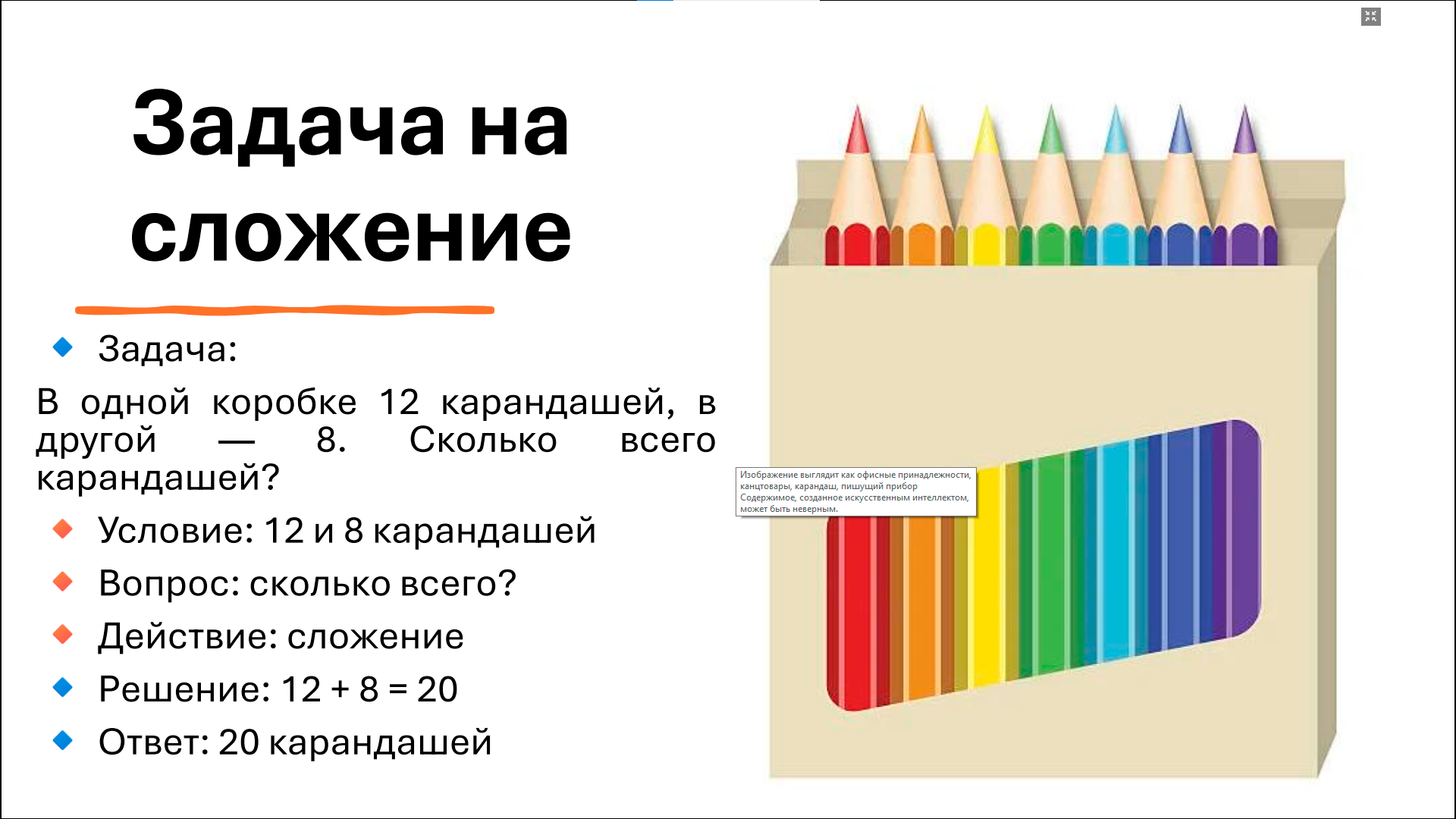А рифметический метод является одним из наиболее традиционных и доступных способов решения текстовых задач, особенно на начальных этапах обучения в основной школе. Сущность данного метода заключается в последовательном выполнении арифметических действий над известными величинами без введения переменных и составления уравнений. Решение строится на логическом анализе условия задачи и рассуждениях, приводящих к получению искомого значения.